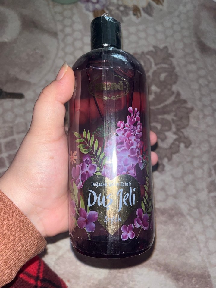 Doğal özlü, çiçek kokulu duş jeli. Mor çiçek desenli şişede, ferahlatıcı temizlik sağlar.