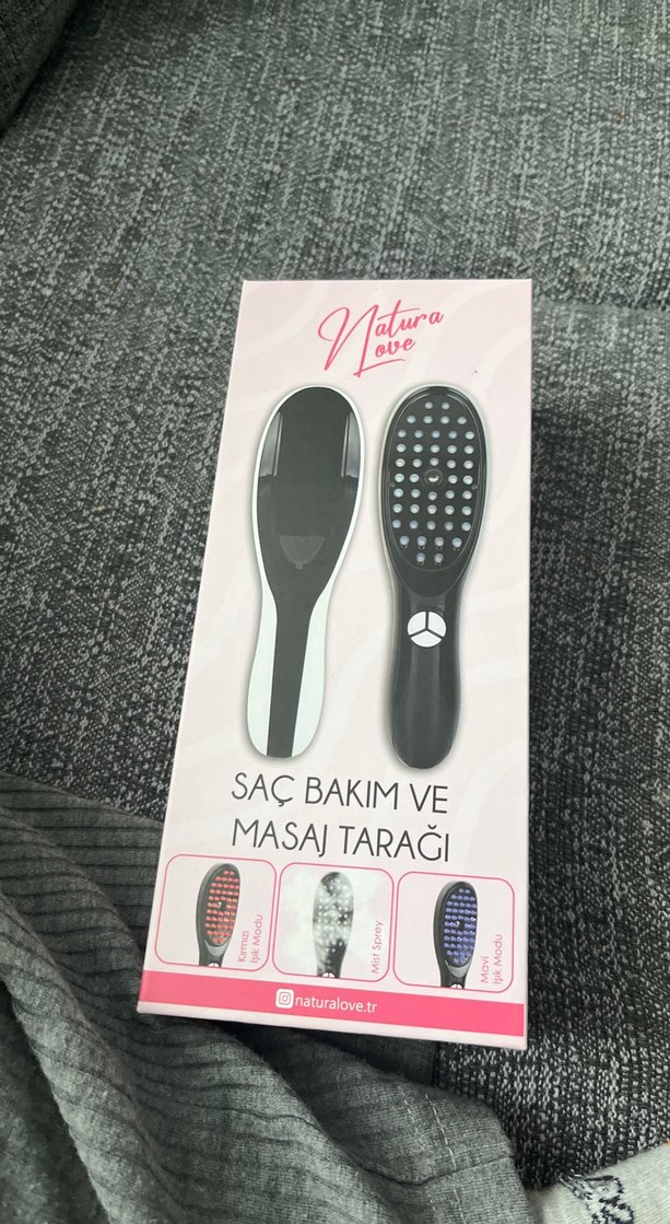 Natura Love markasına ait siyah saç bakım ve masaj tarağı, hafif saç düzleştirme ve kafa derisi masajı için farklı ışık modları sunar.