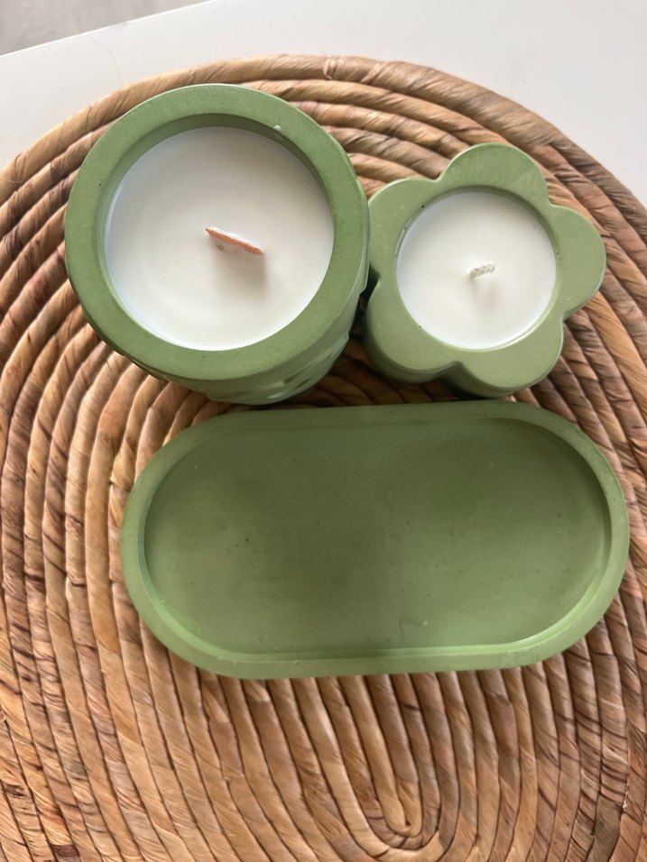 El yapımı olarak doğal soya ile hazırlanan İki farklı şekle sahip yeşil mum ve uyumlu tepsiden oluşan set, sıcak bir atmosfer yaratmak için ideal. ️