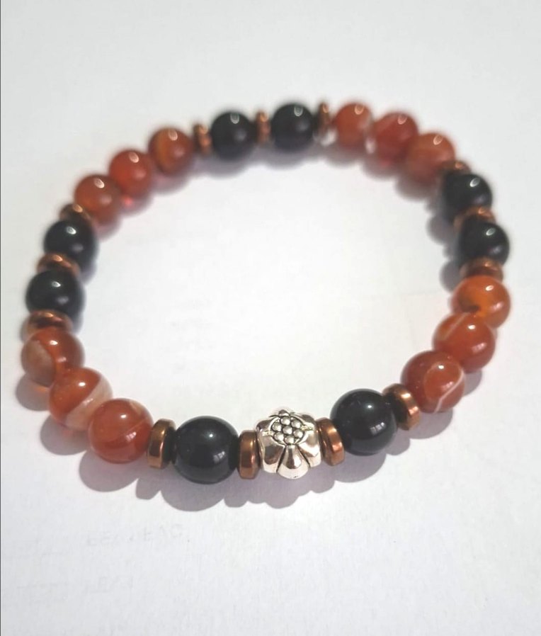 Koyu kahverengi ve siyah boncuklardan oluşan, metal çiçek figürlü bohem ve minimalist tarzda boncuklu bileklik. Günlük kullanıma uygun. Akik taşı
