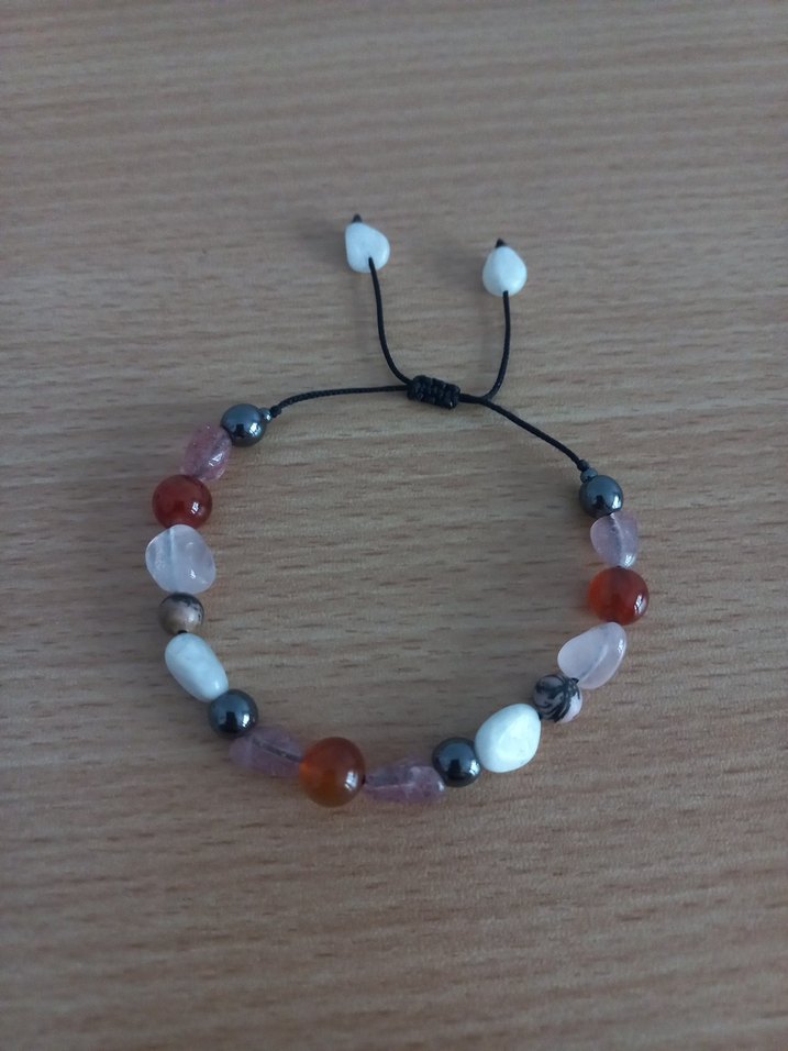 Karnelyan, ay taşı, pembe kuvars, hematit, çilek kuvars, rodonit taşlarıyla yapılmıştır.