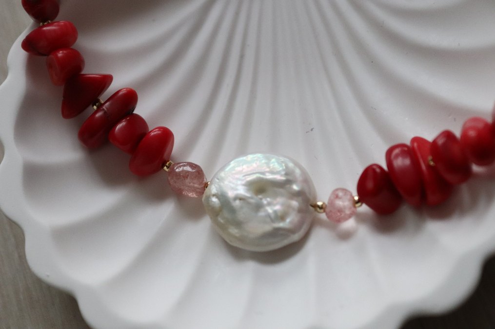 kırmızı Mercan barok inci ve pembe kuvars taşı ile hazırlandı. detaylı bilgi için mesaj bırakabilirsiniz ✨.