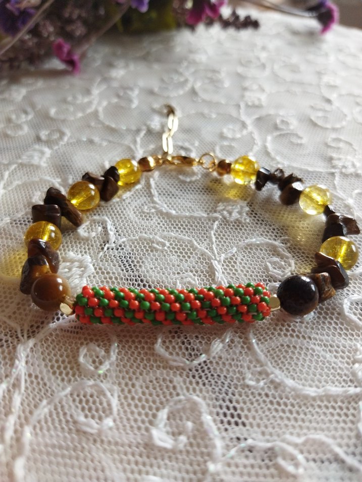 Renkli boncuklar ve doğal taşların karışımıyla bohem tarzda günlük kullanıma uygun bileklik. Sitrin ve Kaplan gözü doğal taşlar ile tasarlanmıştır.Ürün el yapımı olup sıfır üründür.Marka temsilidir.