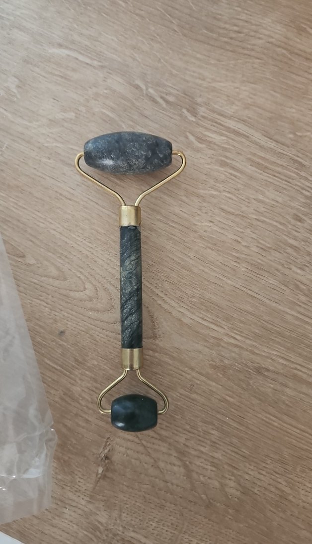 Çift rulolu, altın renkli metal detaylı doğal taş yüz masaj aleti, cilt bakımı için kullanılır. hiç kullanılmadı