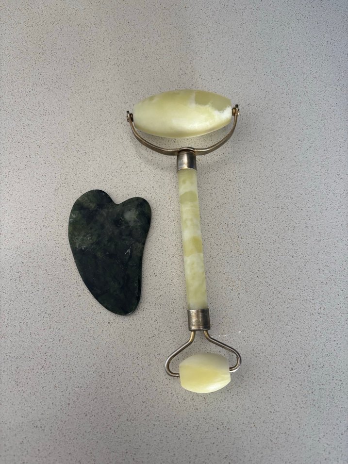 İki farklı boyda doğal taş rulo ve gua sha taşı içeren yüz masaj seti, cilt bakımı ve rahatlama için uygundur.