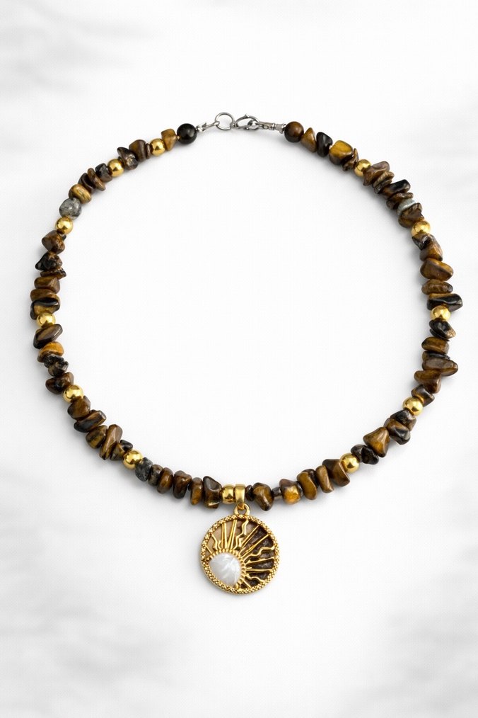 Altın renginde boncuklardan oluşan kısa uzunlukta, tie-dye desenli, bohem tarzda mini kolye.