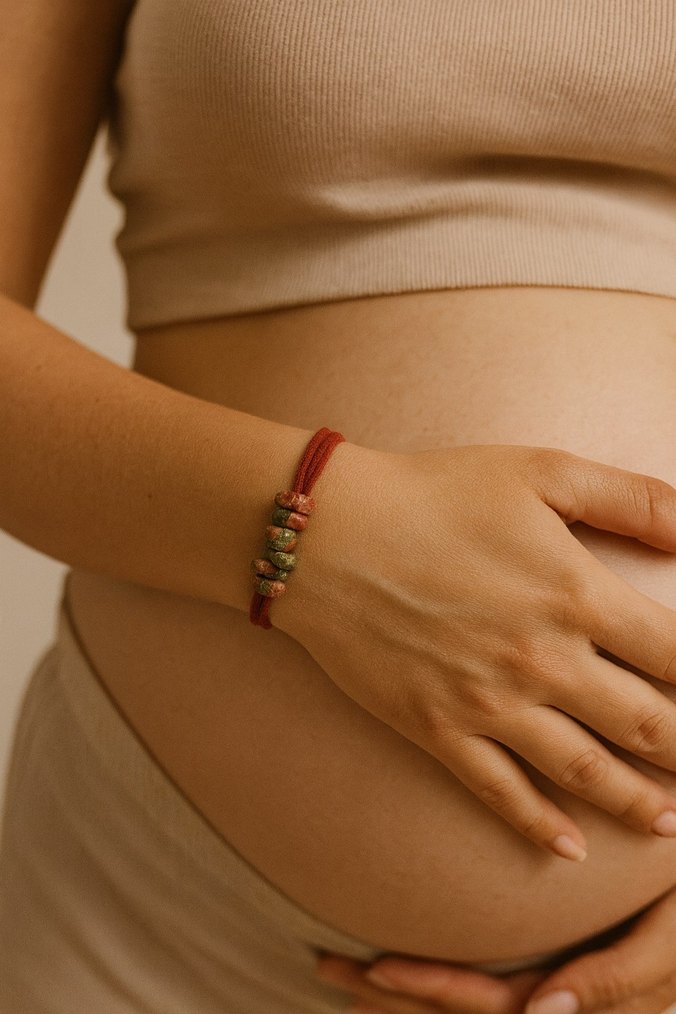 Kırmızı iplerden ve doğal taşlardan oluşan, hamileler için sade ve doğal bir bileklik.