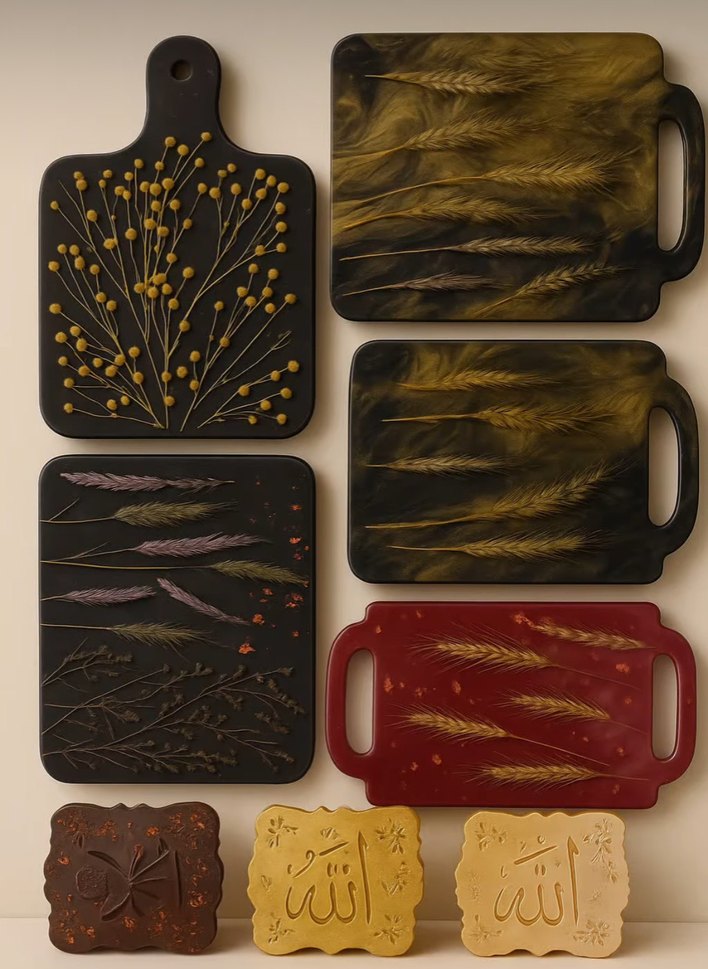 Siyah, kırmızı ve bej renklerde, doğal bitki motifleriyle süslenmiş epoxy kesme ve servis istediğiniz renk ve şekillerde yapılır panoları