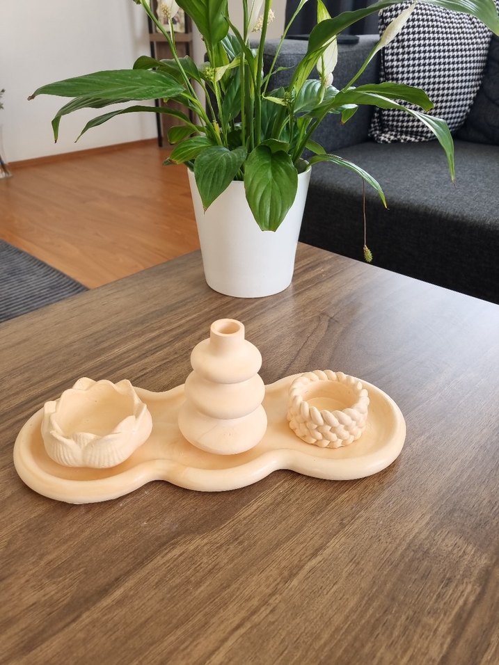 LÜTFEN ILAN AÇTIRINIZ.. Doğal renkli vazo ve mumluk seti, taban üzerinde üç farklı şekil içerir.