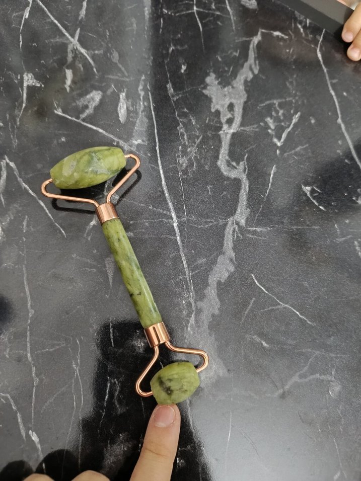 Cilt bakımını destekleyen doğal yeşil taştan yapılmış, çift başlıklı yüz masaj aleti. sıfır ayarında bir kere kullandim. doğal yeşim taşı