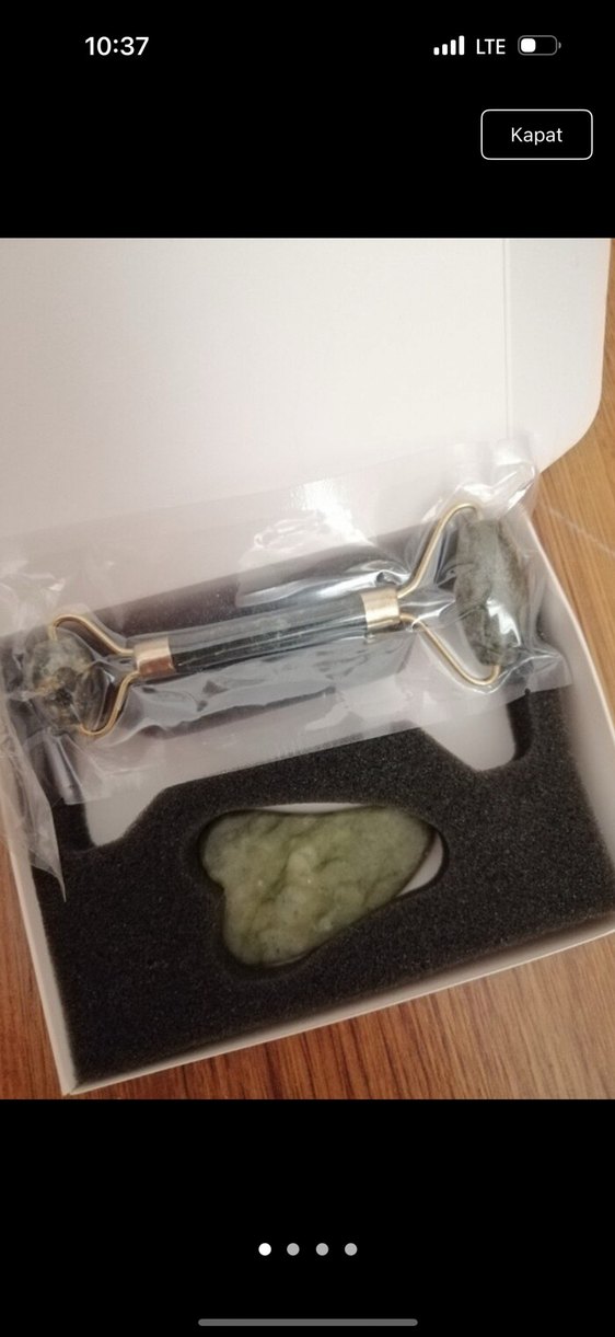 Doğal yeşim taşından yapılmış yüz masaj rulosu ve guasha taşı seti, cilt bakımı için kullanılır. Koruyucu ambalajda sunulmaktadır.