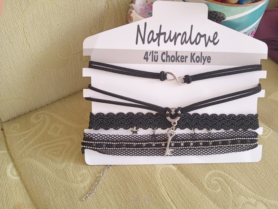 Dört parçalı siyah choker kolye seti, zincir detaylı ve nakışlı desenli bohem tarzda, günlük kullanıma uygun. sıfırdır alana hayırlı olsun set fiyatidir