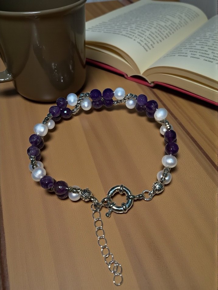Mor ametist ve gerçek kültür incilerinden oluşan, gümüş rengi gemici kilit minimalist bohem tarzda kadın bileklik, günlük kullanıma uygundur.