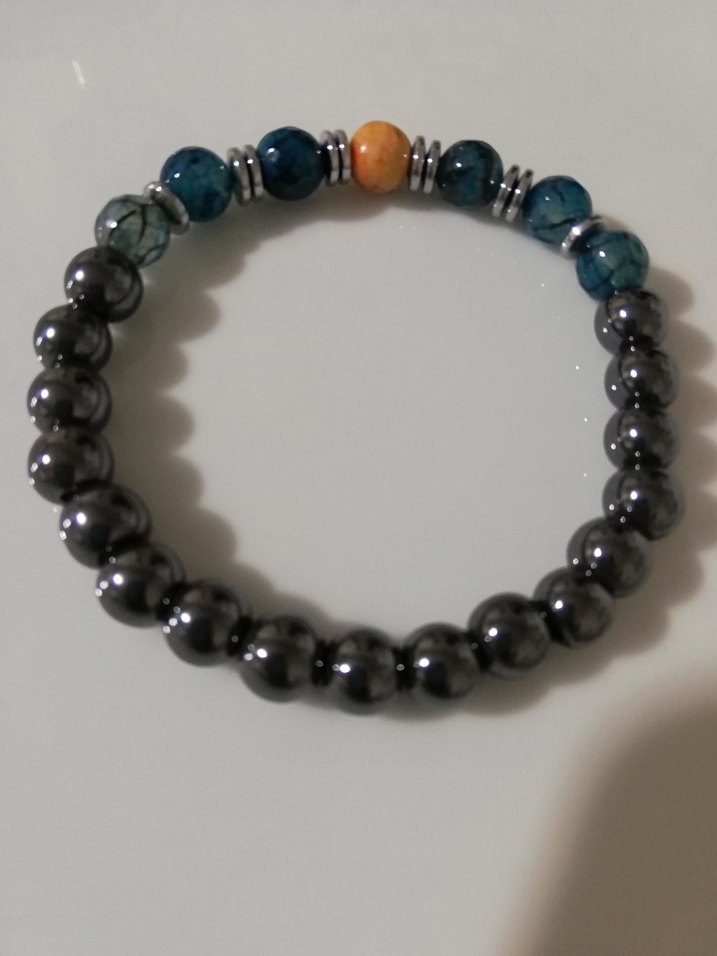 HEMATİT AKİK VE CASPER DOĞALTAŞ İLE TASARLANMIŞTIR.Bu boncuklu bileklik, koyu turkuaz boncuklar, tek turuncu boncuk ve gümüş detaylar içerir. Bohem tarzı ve batik desenlidir, günlük kullanıma uygundur.