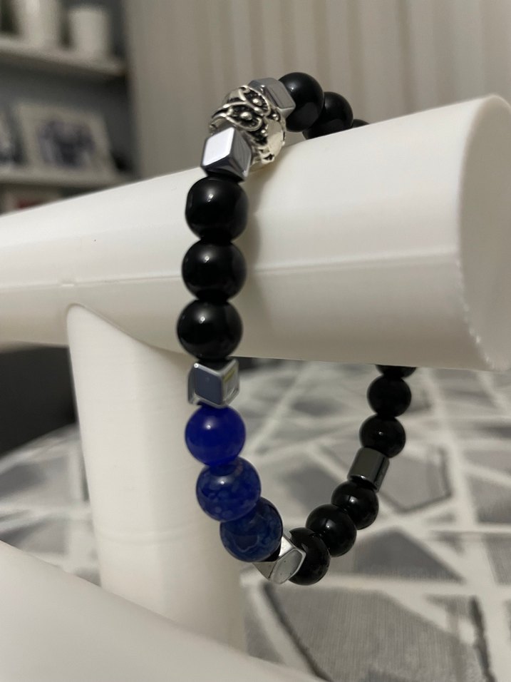 Koyu mavi ve siyah boncuklarla yılan deseni detaylı, gotik rock punk havası taşıyan çağdaş bileklik. Günlük kullanım için uygundur. Erkek bileklik. El yapımı.