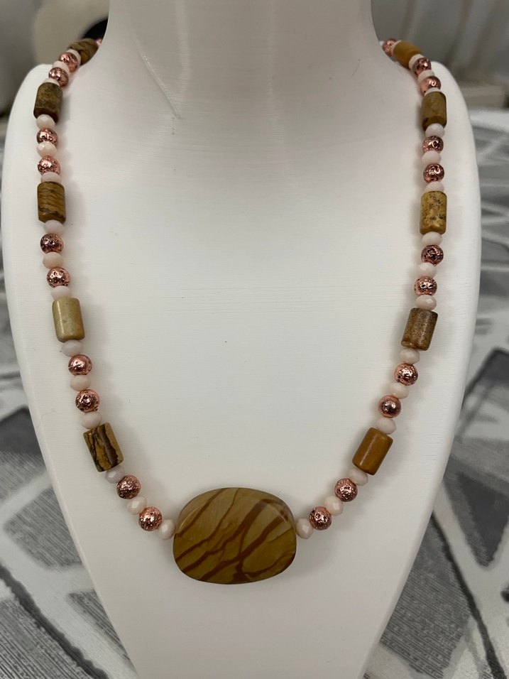 Doğaltaş kolye ortasında jasper taşı , Kahverenfi uzun taşlar Jasper taşıdır, yuvarlak bakır renk taş Hematit taşıdır. El yapımı kolye boncuk itibari ile 42,5 cm dir. bej kolye, çeşitli boncuklar ve büyük desenli bir merkez taşı ile bohem tarzını yansıtıyor. Romantik akşamlar için uygun.
