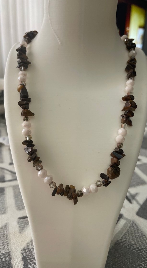Doğaltaş Kaplangözü tasarım kolye. Yılan desenli boncuklardan oluşan midi kahverengi bohem tarzda kolye, günlük kullanım için uygundur. Kolye uzunluğu boncuk itibari ile 39 cm dir.