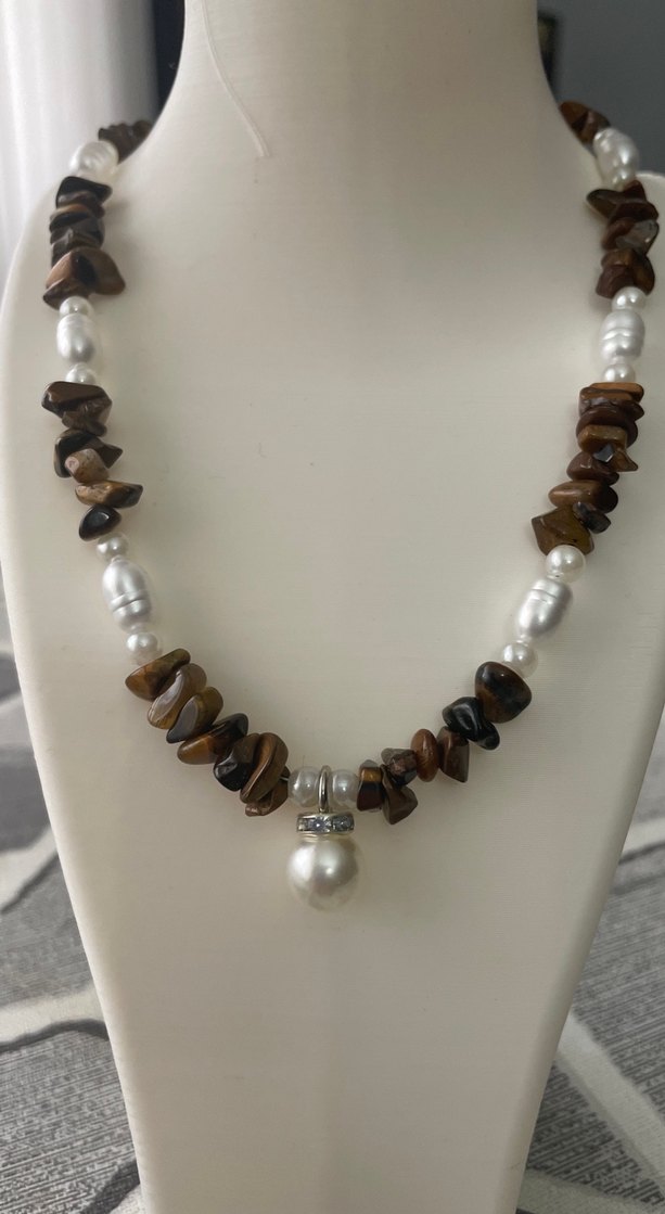Doğal taş Kaplangözü ve inci görünümlü boncuklardan oluşan uzun kahverengi kolye, romantik buluşmalar için bohem tarzda. Kolye uzunluğu 41,5 cm dir