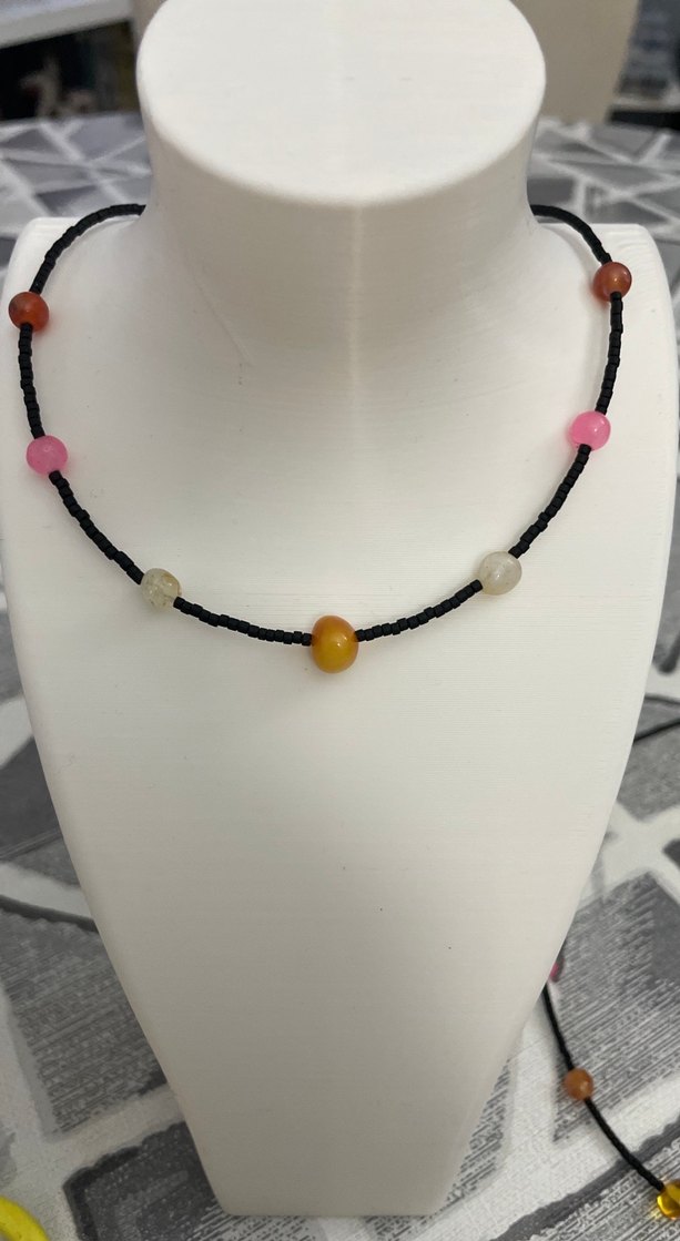 Doğaltaşlardan oluşturulmuş kolye Kehribar, Sitrin, Pembe Kuvars, Akik taşı ve aralarda siyah boncuklarda tasarlanmış şık kadın kolye. Bohem tarzda, koyu tonlu çok renkli küçük boncuklardan oluşan midi uzunlukta kolye, romantik buluşmalar için uygun. Uzunluk 37 cm dir.