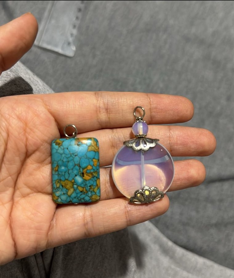 Renkli bohem tarzda, boncuklu turkuaz dikdörtgen ve metal detaylı ay taşı yuvarlak kolye uçları. Günlük kullanıma uygun. Metal kısımları gümüş olabilir emin değilim. El yapımı doğal taş kolye uçları.