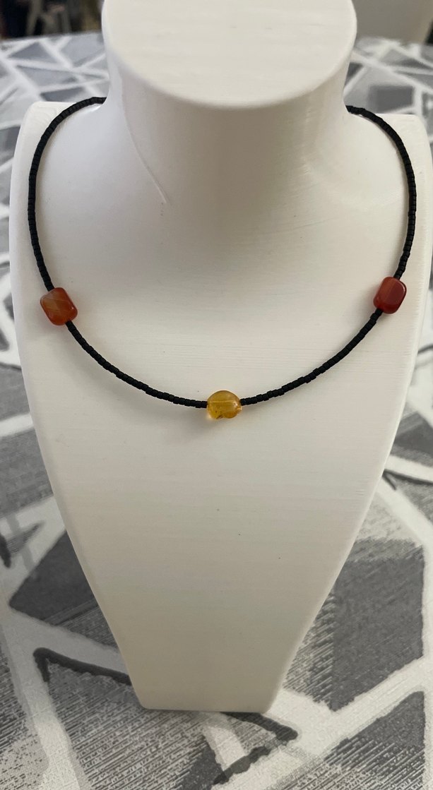 Doğaltaş Kehribar ve Akik taşı mevcuttur, siyah boncuklardan oluşan, midi uzunlukta kolye. Günlük kullanıma uygun, minimal ve retro havasında. Kolye uzunluğu 37,5 cm dir.