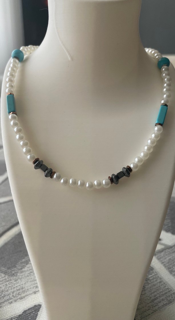 Doğal taşlardan tasarlanmış kolye. Uzun, beyaz boncuklar ve turkuaz ile gri detaylara sahip kolye, minimalist ve bohem tarzları yansıtır. Günlük kullanım için uygundur. El yapımı kolye uzunluğu 39,5 cm.