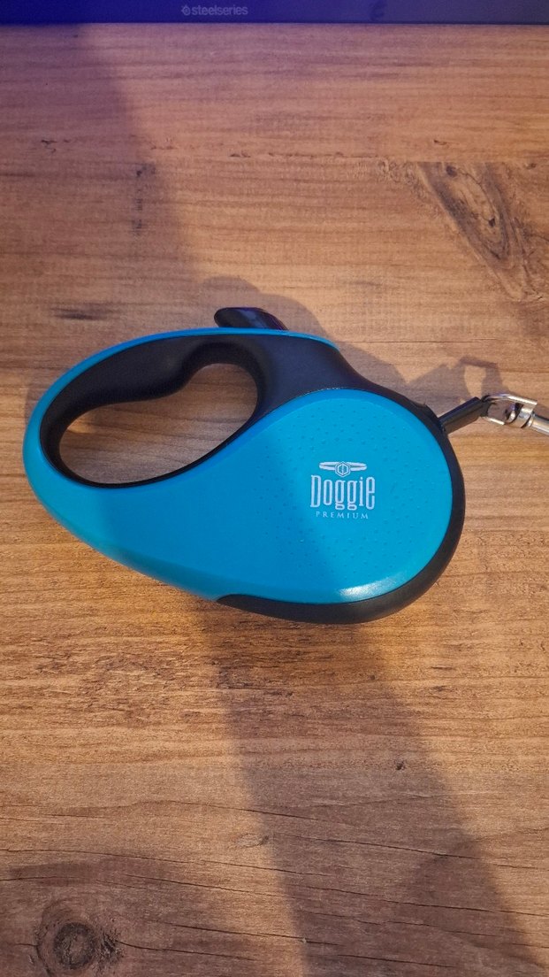 Ergonomik saplı ve otomatik açılır kapanır tasarıma sahip turkuaz renkli "Doggie" marka köpek gezdirme kayışı. Kayışta hafif deforme mevcuttur
