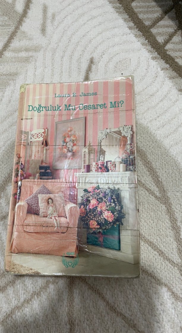 Laura E. James'in "Doğruluk Mu Cesaret Mi?" adlı romanı, çiçekli ve vintage dekorlu rahat bir odanın kapak görseline sahip.