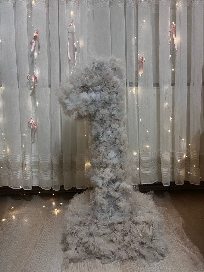Doğum günü partileri için 1 rakam süsleme, kutlamalara yumuşak ve şık bir dokunuş katıyor. Pudra pembesi ve beyaz tüller ile kaplandı. Evde kendim yaptım. 1 rakam dekor. Doğum gününde kullandık.