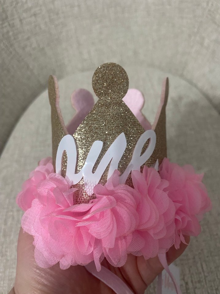 Hafif pembe, fırfırlı kumaştan yapılmış, üstünde "one" yazılı simli altın taç bulunan bohem tarzda saç bandı.