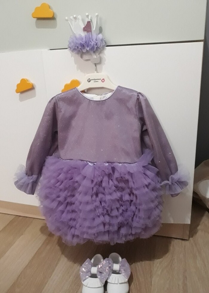 Kiz bebek doğum günü elbisesi ayakkabı ve tacı 1 saat üzerinde durdu ayakkabı makosen 20 numara, elbise 1 yaş için.