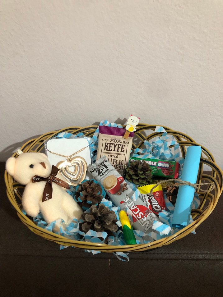 ✨ Sevdiklerinizi mutlu edebileceğiniz özenle hazırlanmış hediye sepeti stoktadır. Sepet içeriğinde Ayıcık anahtarlık, Kalpli gold kolye, Türk kahvesi, meyveli sakız, 2 si bir arada kahve, Ayıcık çikolata, Altın çikolata, Mısır kalem, Ahşap mini mandal ve Rulo not kağıdı mevcuttur nota dilediğinizi yazabilirsiniz. Sepet büyüklüğü enlemesine 30 cmdir. Sağlam kargolama yapılır.