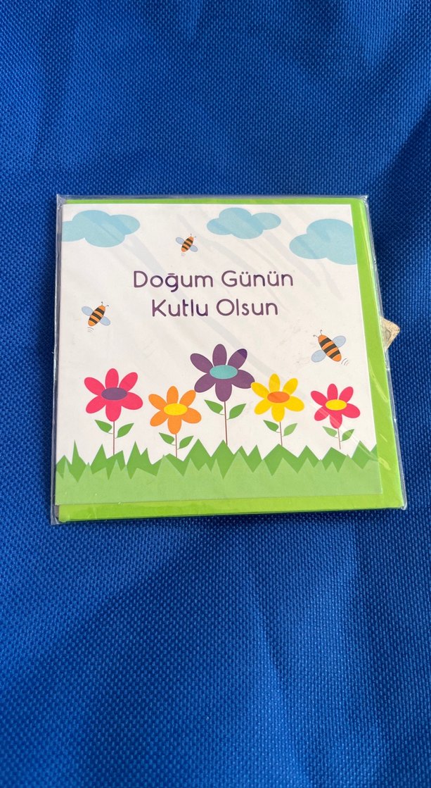 Renkli çiçekler ve arılarla süslenmiş, "Doğum Günün Kutlu Olsun" mesajı içeren çocuklar için doğum günü tebrik kartı