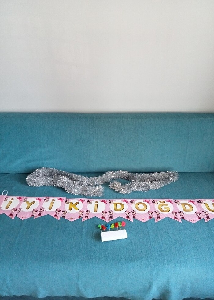 Bir kere kullanılıp kaldırılmıştır. Hiçbir deformasyon yoktur. Yepyenidir. Rakamlı Mumlar . Minnie mouse duvar flaması ve gümüş rengi duvar süsu