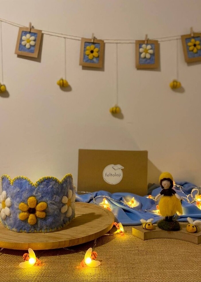 Sete dahil olanlar: • 4 adet keçeden çiçekli pano (iki beyaz papatya, iki sarı çiçek) • 5 adet asılabilir keçe arı • Askı ipi ve minik mandallar .uzunluk 2 metre .doğum günü tacı .bebek, 2 arı ve kütük