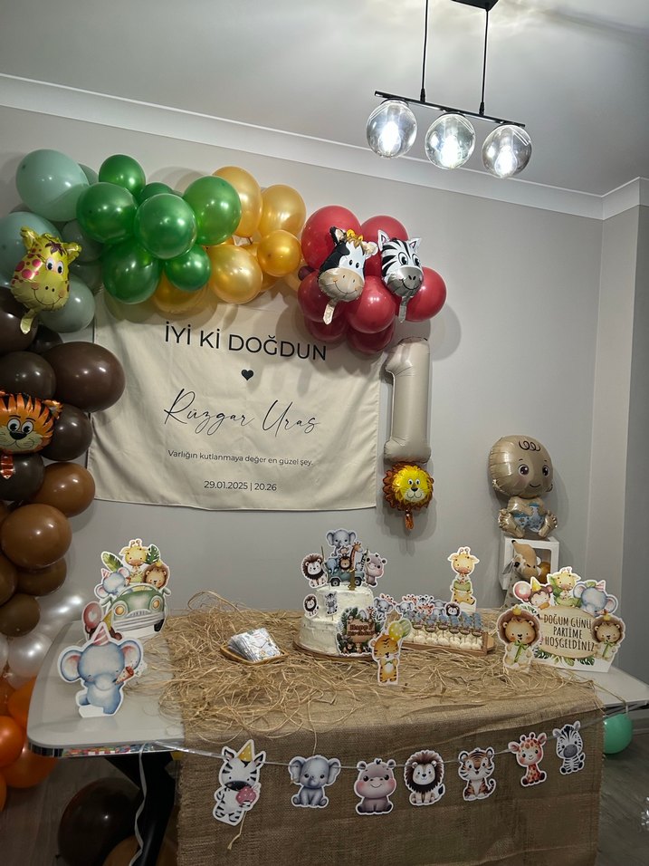 Pasta üzeri süsler 1 yazılı mum+ Hayvan figürleri Masa örtüsü + rafya Masa üzeri hayvan figürleri 1 yazılı balon (Sadece 1 kez doğum günü için kullanıldı)