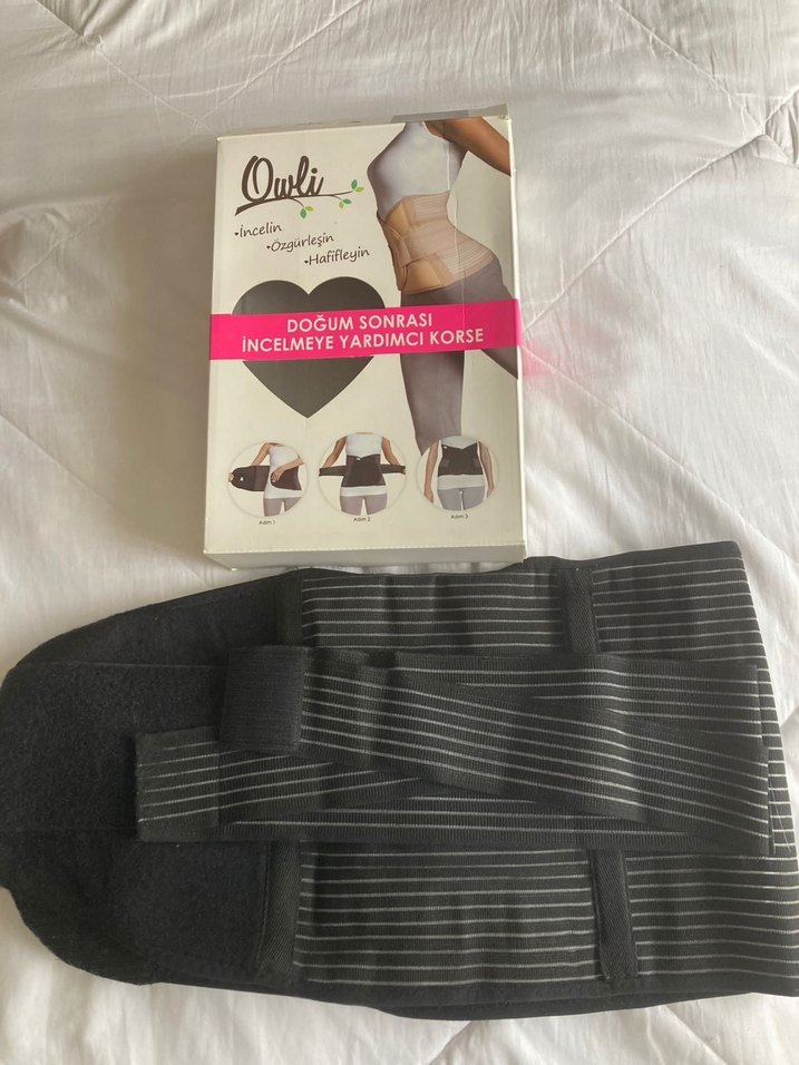 Doğum sonrası incelmeye yardımcı, baskılı desenli, kısa ve vücuda oturan siyah korse. Ayarlanabilir bantlı destek sağlar. Doğum sonrası süreç için mutlaka olması gereken ürün. Tertemiz yeni gibidir. Özellikle sezaryen doğum sonrası beni ayaga kaldıran ürün oldu. İlk dogumumda alıp kullanmıştım. Cok memnun kaldım bantları sapasağlam fotoğraflarda da görüyorsunuz.