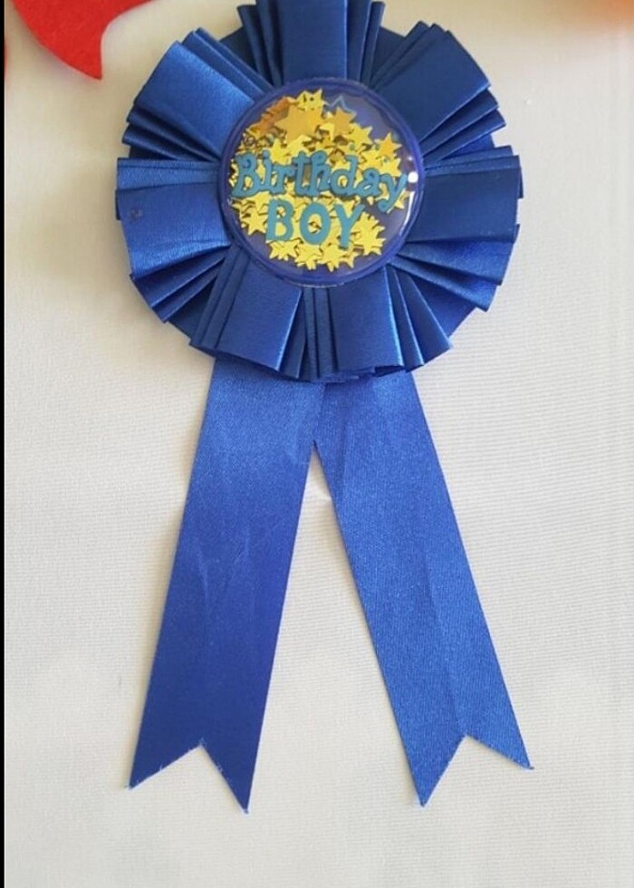 Doğumgünü Rozeti ve Pasta Süsleri. Doğumgünü olan çocuğun yakasına takılan doğumgünü rozeti, erkek çocuklar için. Yanında pasta için süsler.