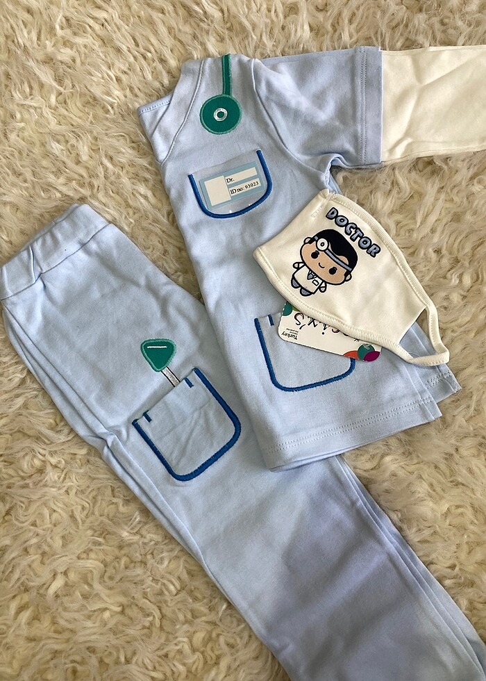 Maskesi var. Cırt cırtlı şiringa ve isim kartlığı olan doktor kostümü