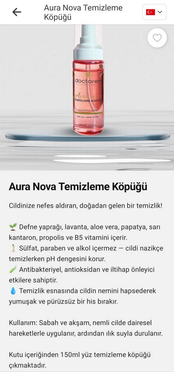 Aura Nova temizleme köpüğü, cildinizi nazikçe temizlerken pH dengesini korur. Defne yaprağı, lavanta, aloe vera, papatya, sarı kantaron, propolis ve B5 vitamini içerir. Sülfat, paraben ve alkol içermez, antibakteriyel, antioksidan ve iltihap önleyici etkilere sahiptir.