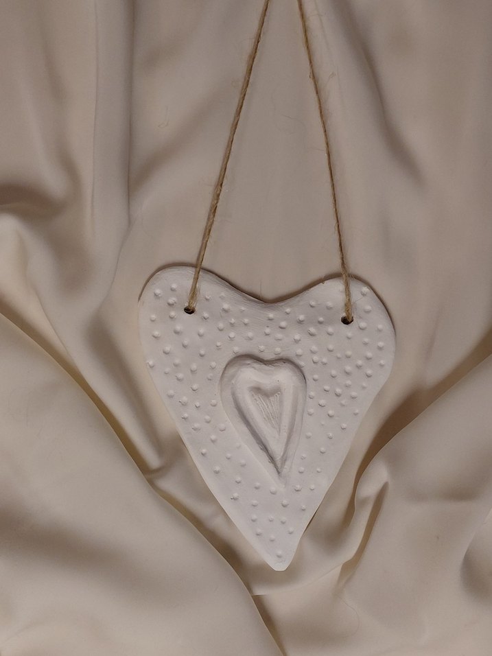 Beyaz renkte, dokulu ve kalp şeklinde duvar süsü. Minimalist ve bohem tarzda, romantik anlar için uygundur