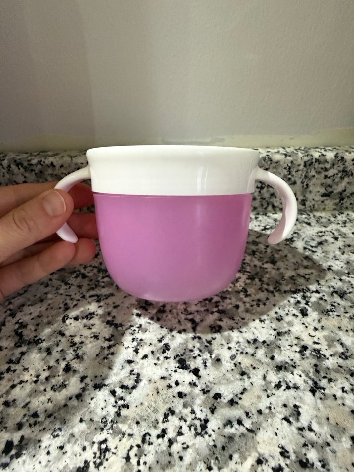 Pastel pembe gövde ve beyaz kulplara sahip bebek bardağı, bebeklerin kolay tutması için tasarlanmıştır.