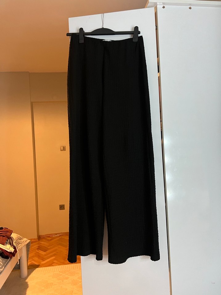 Uzun boy, dokulu ve siyah renkte kadın kumaş pantolon. İpek gibi dokusu ve sade tasarımıyla ofis için uygundur. Normcore tarzda, rahat kesim.