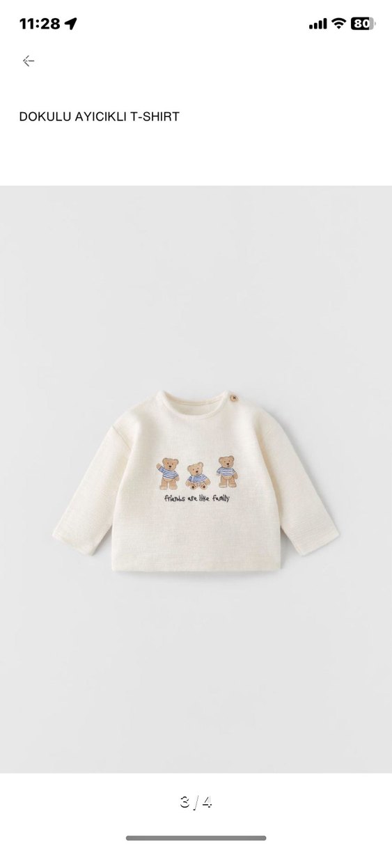 Beyaz, örme dokulu pamuklu tişört yuvarlak yaka Gevşek kesimi ve pastel tonlarda ayıcık baskısı bulunur.