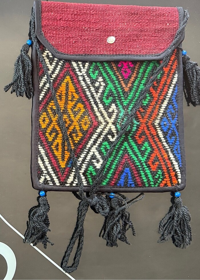Antika dokuma örgü hem omuz hem kol çantası, etnik çanta, bohem çanta, telefon taşıma çantası. Askılı, çapraz çanta. Askısı ayarlanabilir, hem çapraz, hem kol hem de omuz çanta şeklinde kullanılabilir. En: 24cm - Boy: 30cm.