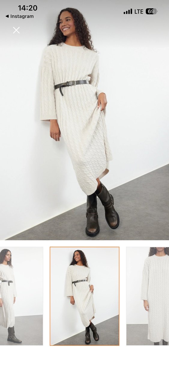 Beyaz triko elbise, dökümlü kesim ve uzun boy. Kayık yaka ve askılı kolları var. Deri kemerle tamamlanmıştır. Günlük kullanıma uygun. Swisten almıştım S/M uyumlu taş rengidir