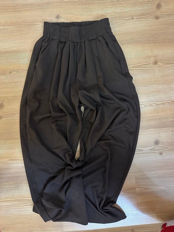 kahverengi kumaştan, bol kesim ve pileli tasarıma sahip, rahat ve günlük kullanıma uygun uzun kadın pantolon. Lastikli bel detayı bulunur.