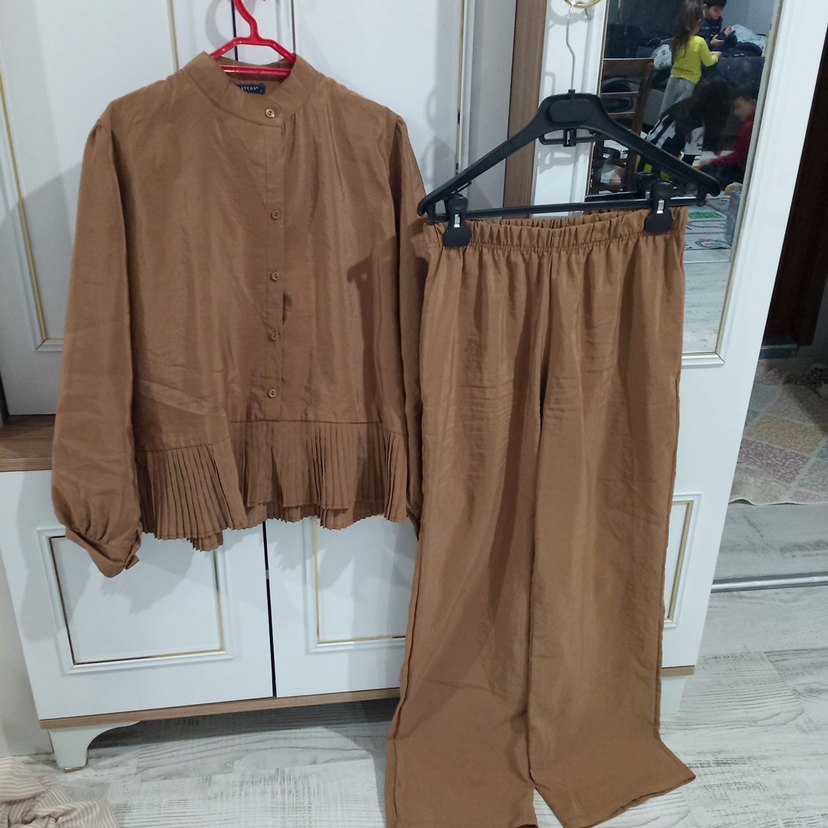 Kahverengi keten kumaştan, dökümlü kesim ve pilili detaylara sahip uzun kollu üst ve midi boy pantolonlu kadın takımı.