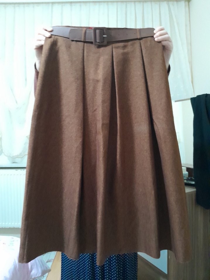 Kahverengi, parlak keten kumaştan, dökümlü ve pileli midi etek. Bohem vintage tarzında, günlük kullanıma uygun.Kışlık havaya uygundur.