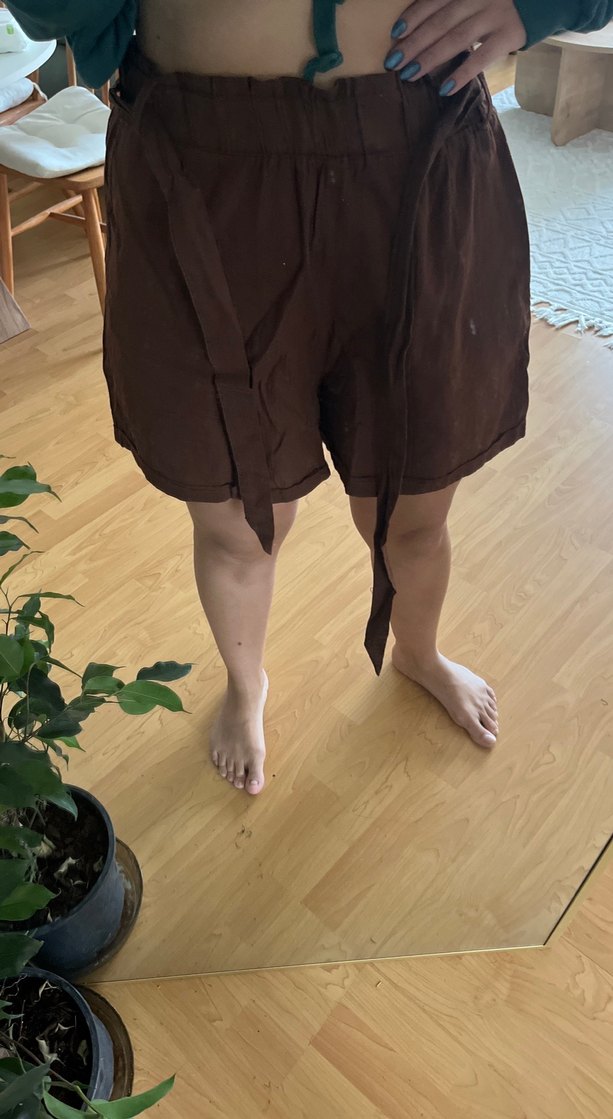 Dökümlü, kahverengi midi hamile şortu, ipeksi dokusu ve minimalist, desensiz tasarımıyla günlük kullanıma uygundur.